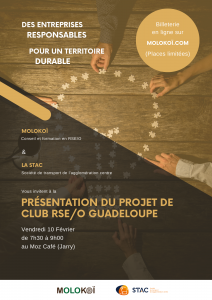 MOLOKOÏ et la STAC sont heureuses de vous inviter à la présentation du projet de création du premier club RSE de Guadeloupe le vendredi 10 Février 2023 de 7h30 à 9h00 au Moz Café, à Jarry.